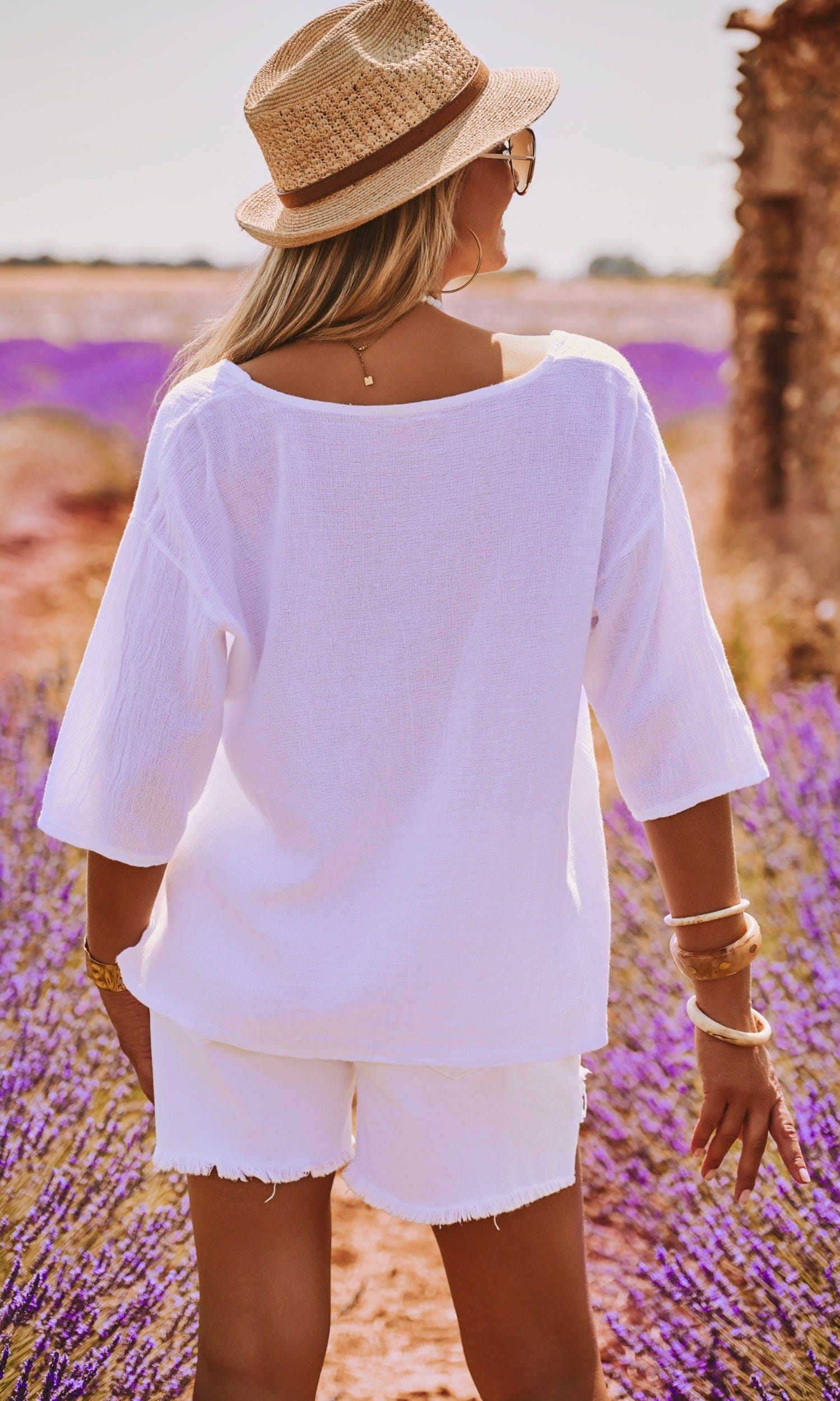Plus courte sur le devant, elle est rehaussée d'une délicate broderie MDS.