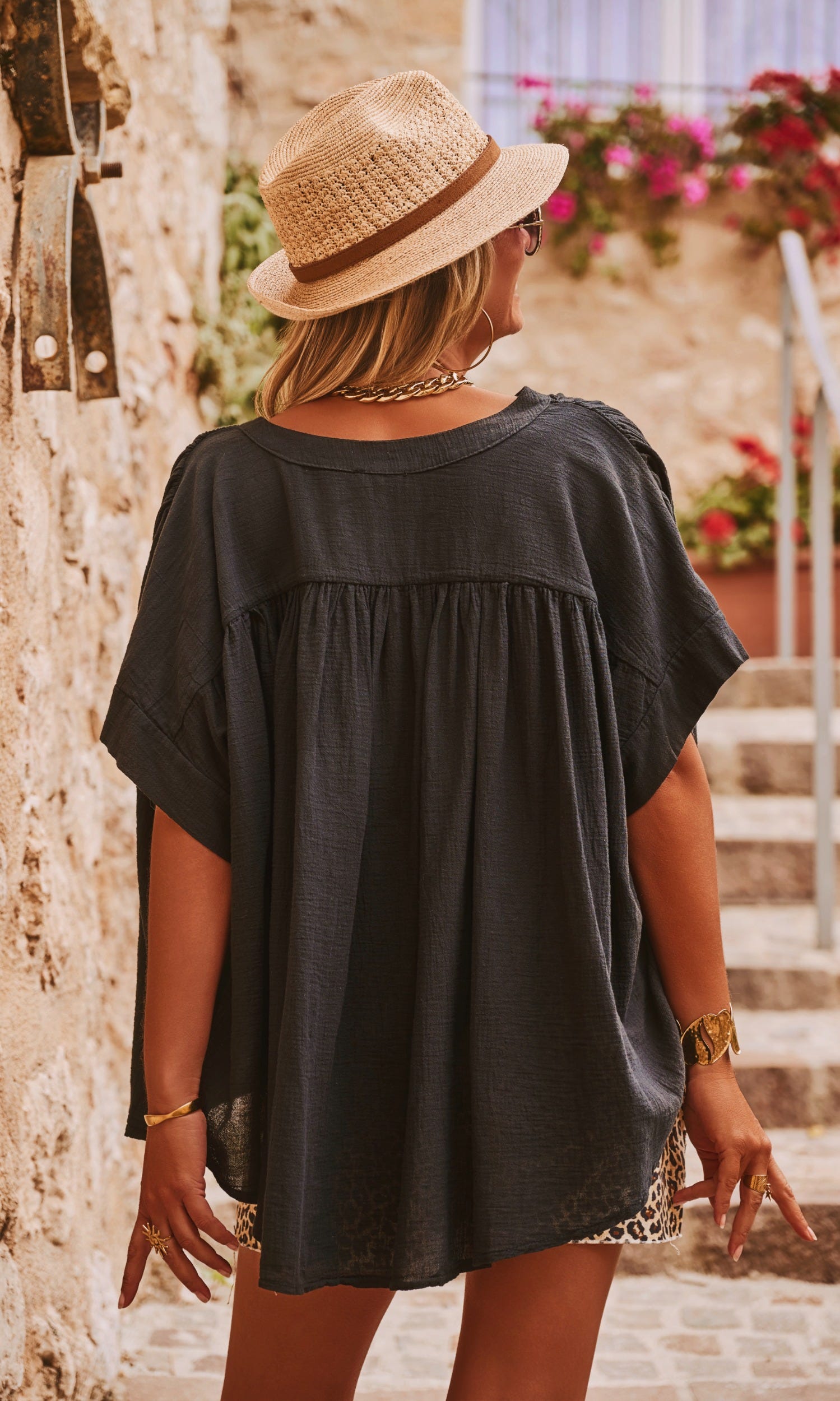 Sa coupe oversize et son col rond agrémenté de quatre boutons offrent un style décontracté et moderne.