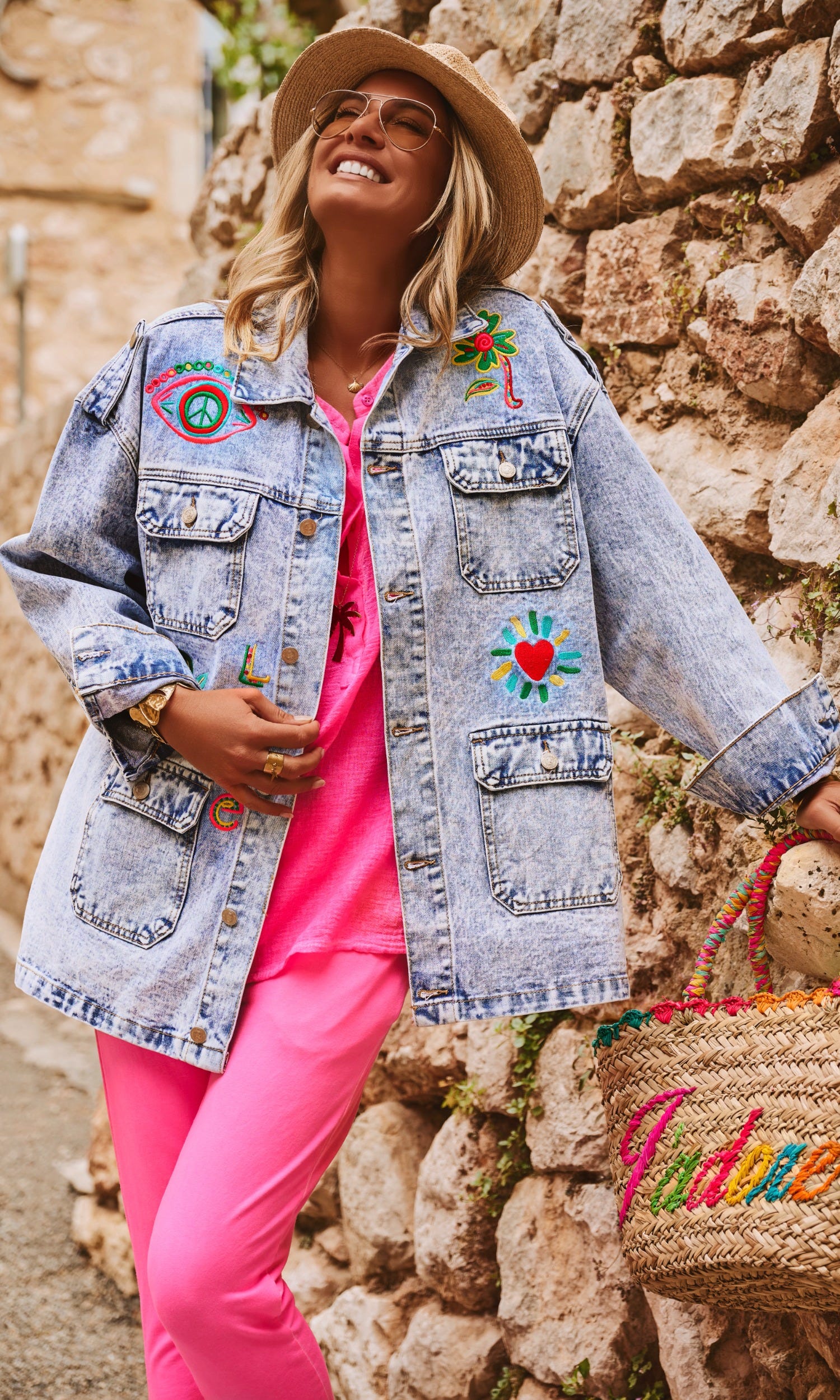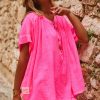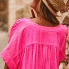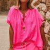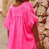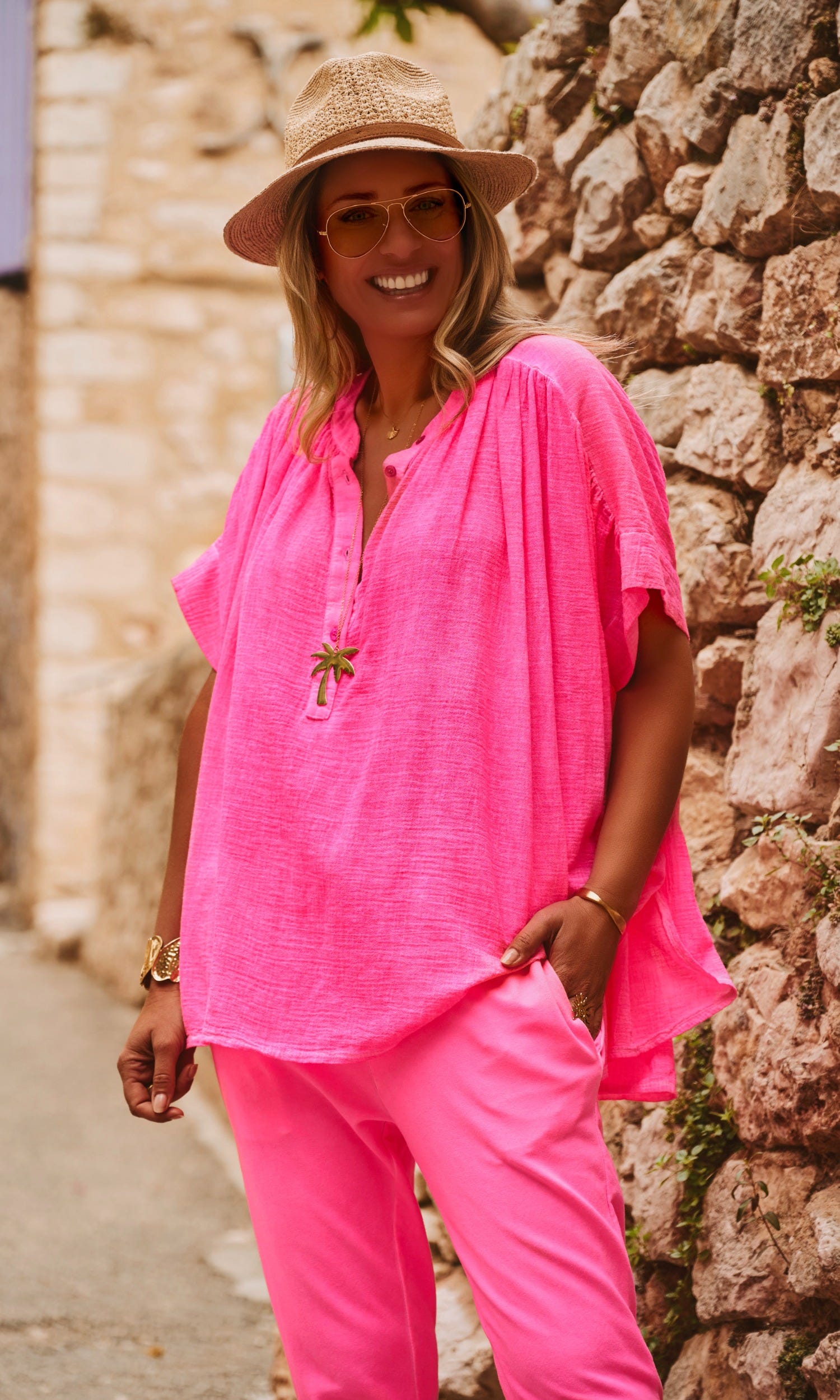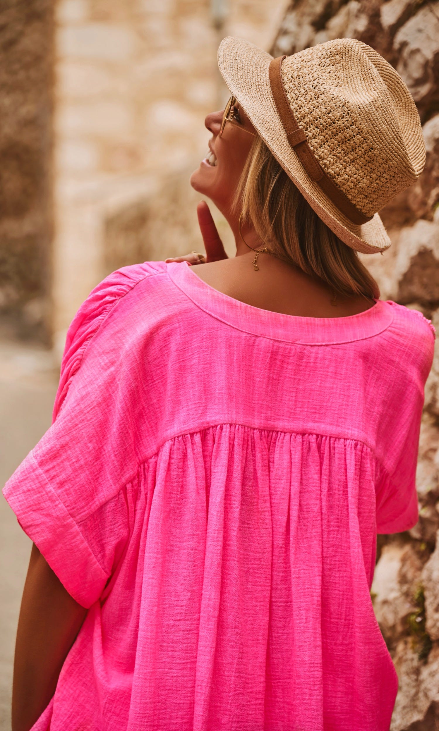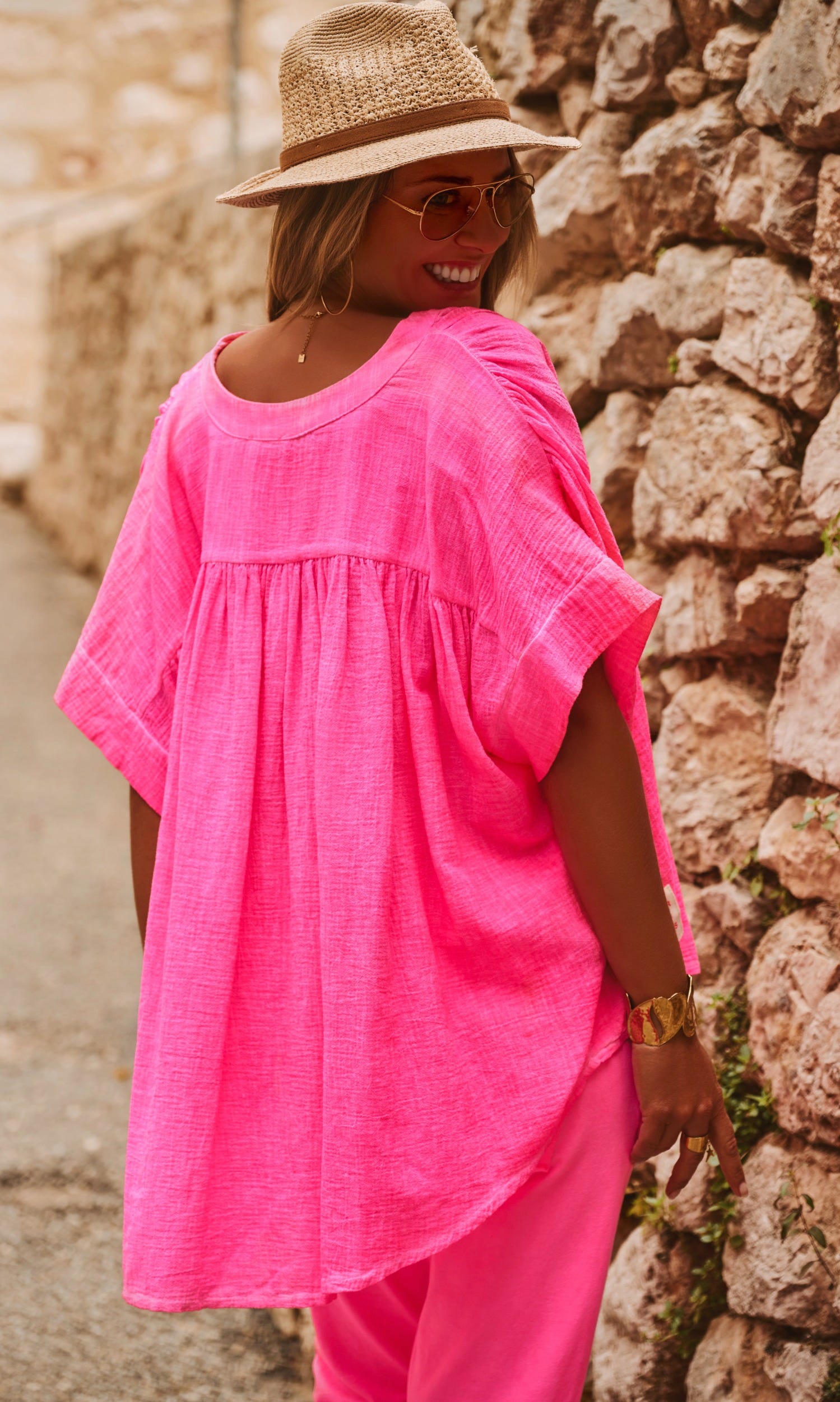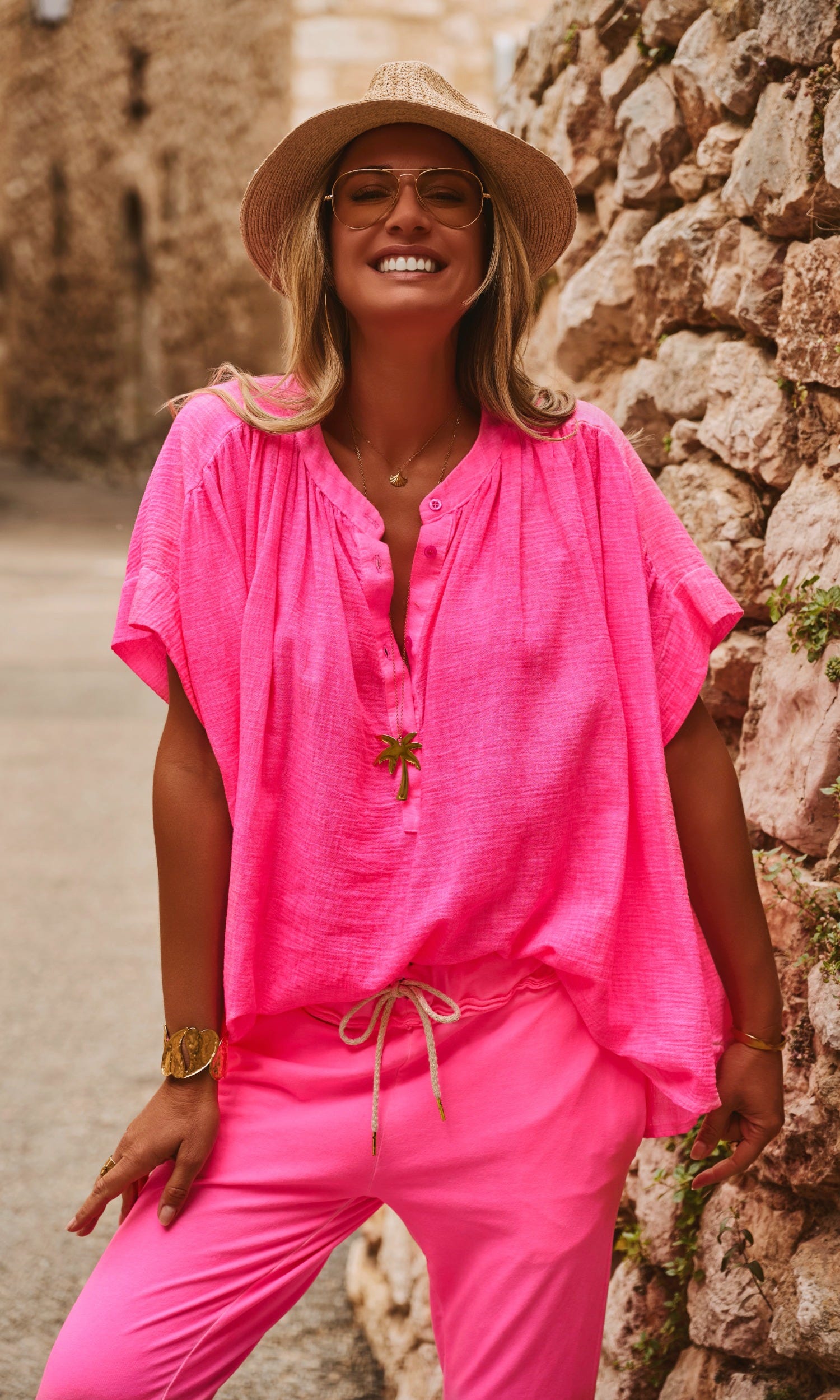 Adoptez la tendance avec cette tunique rose fluo fluide à la coupe oversize.