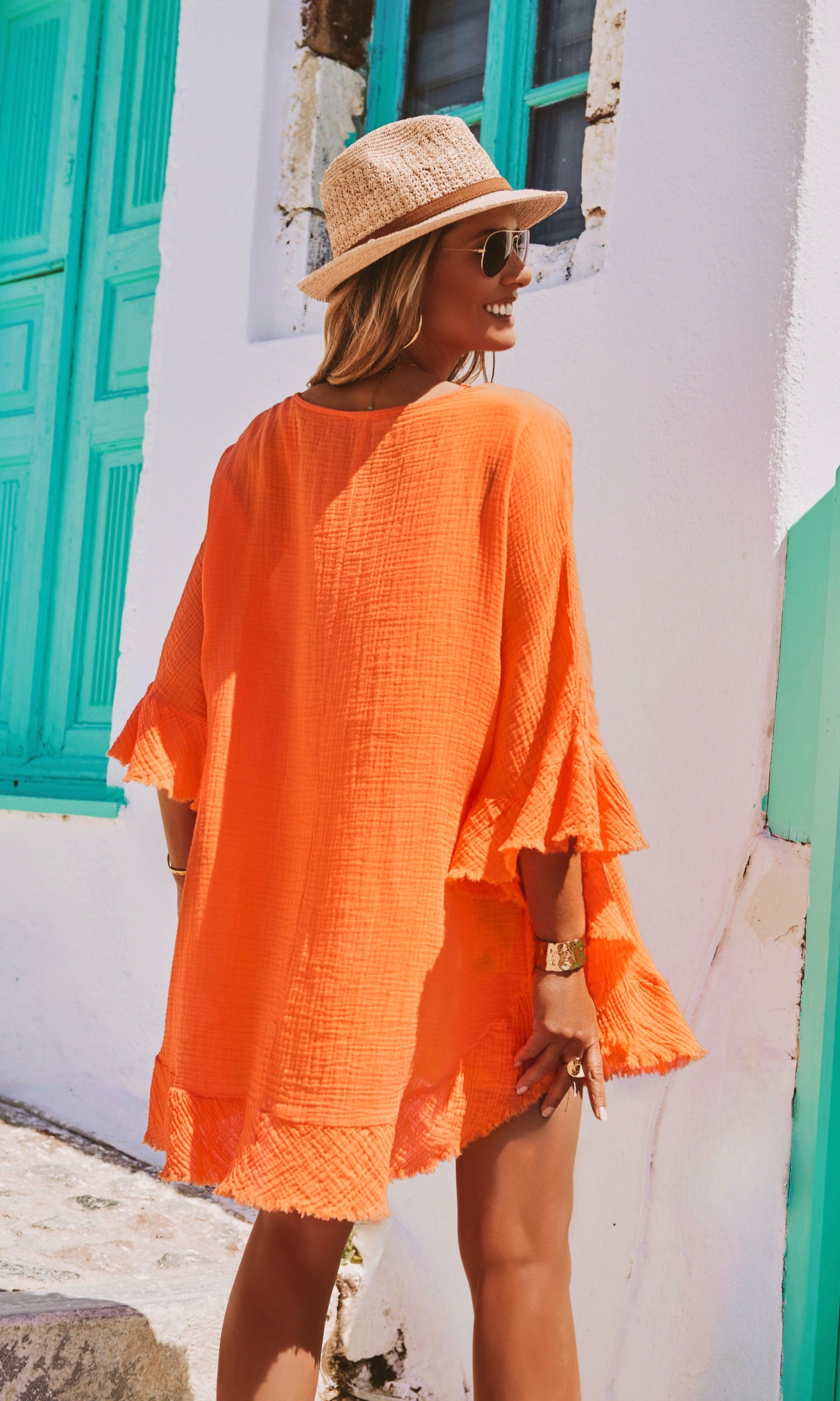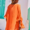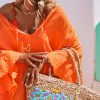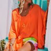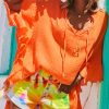 Cette tunique oversize en voile de coton orange, au style poncho, arbore un col V fermé par un cordon
