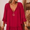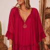 Dotée d'un col en V avec cordon tressé, elle arbore de longues manches avec volants délicats et un bas également orné d'un volant.