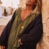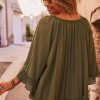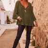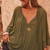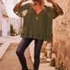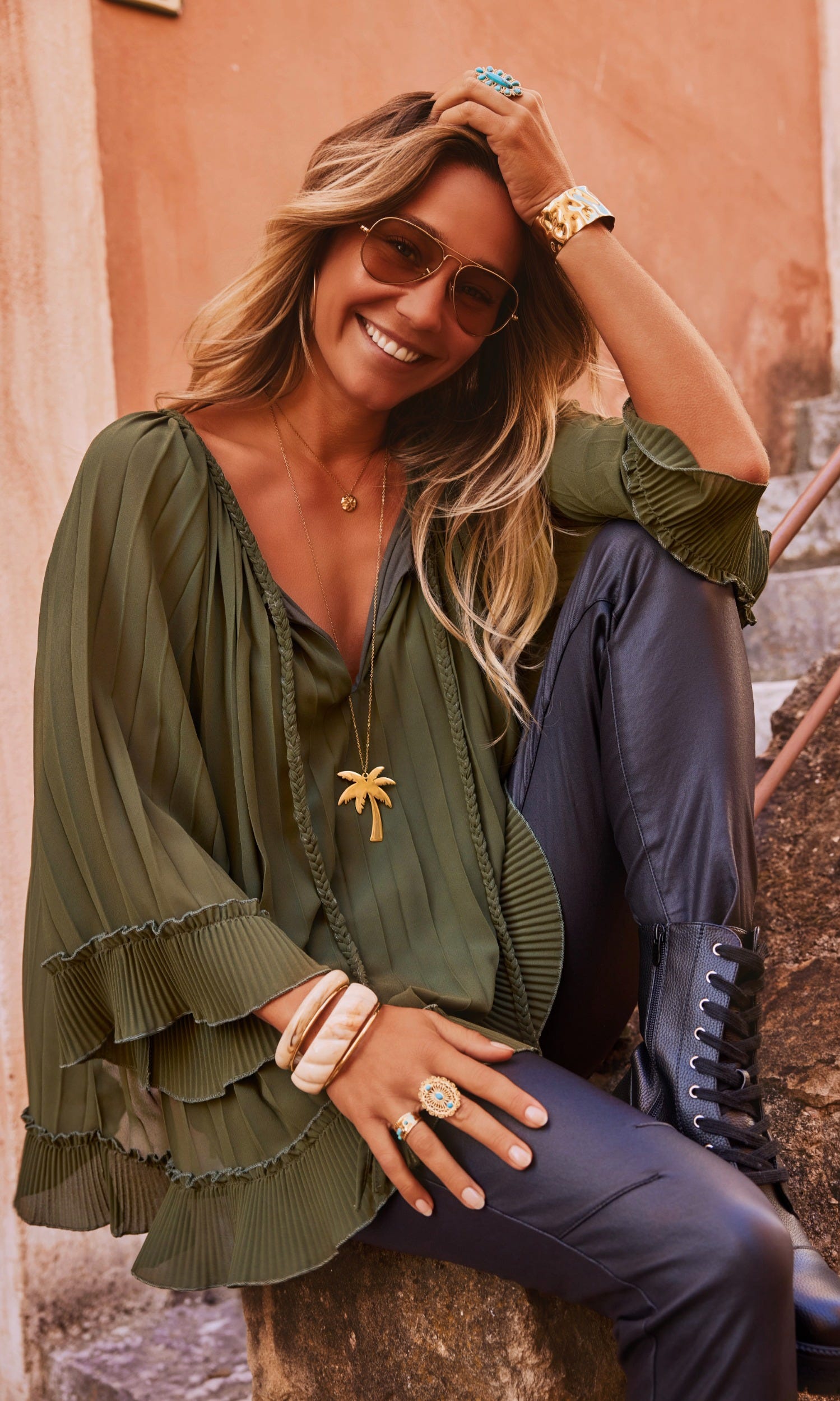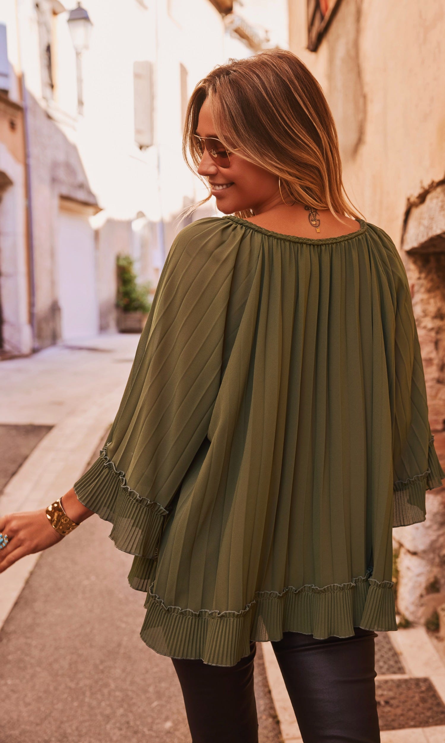 Découvrez notre tunique kaki en voile, élégamment plissée et dotée d'un col V avec cordon tressé.