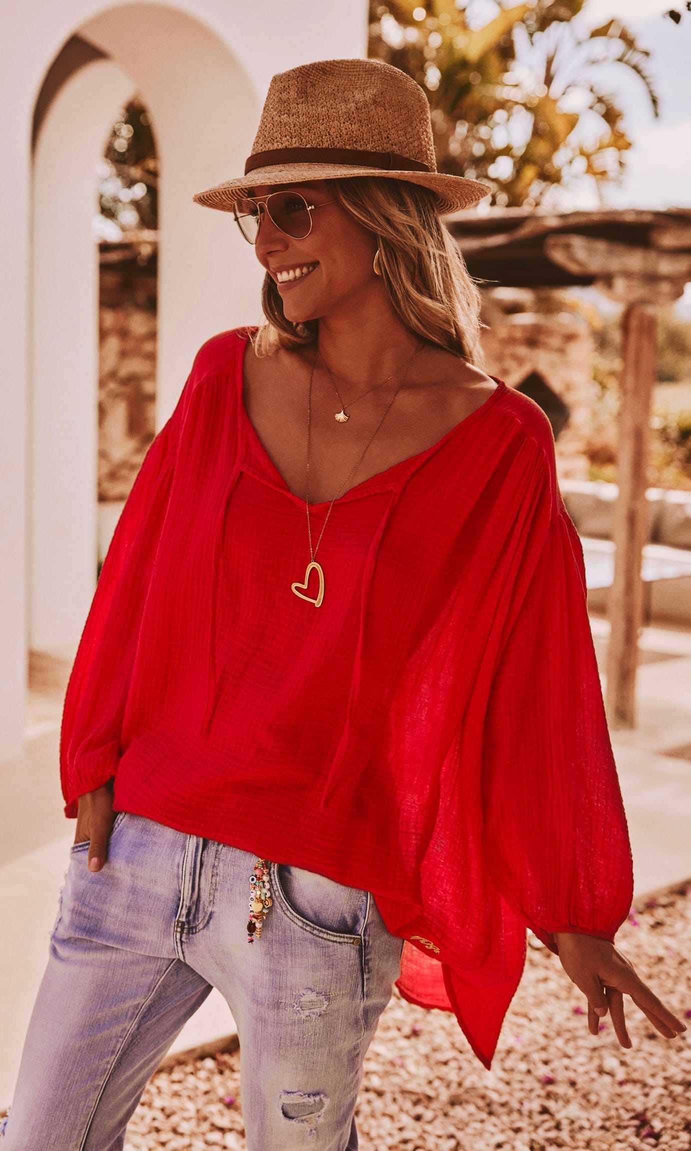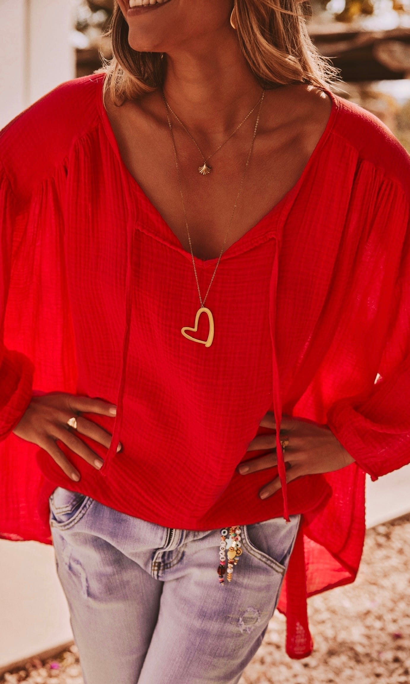 Son col V, fermé par un cordon, ajoute une touche d'élégance, tandis que les manches longues bouffantes et les poignets élastiques assurent confort et fluidité.
