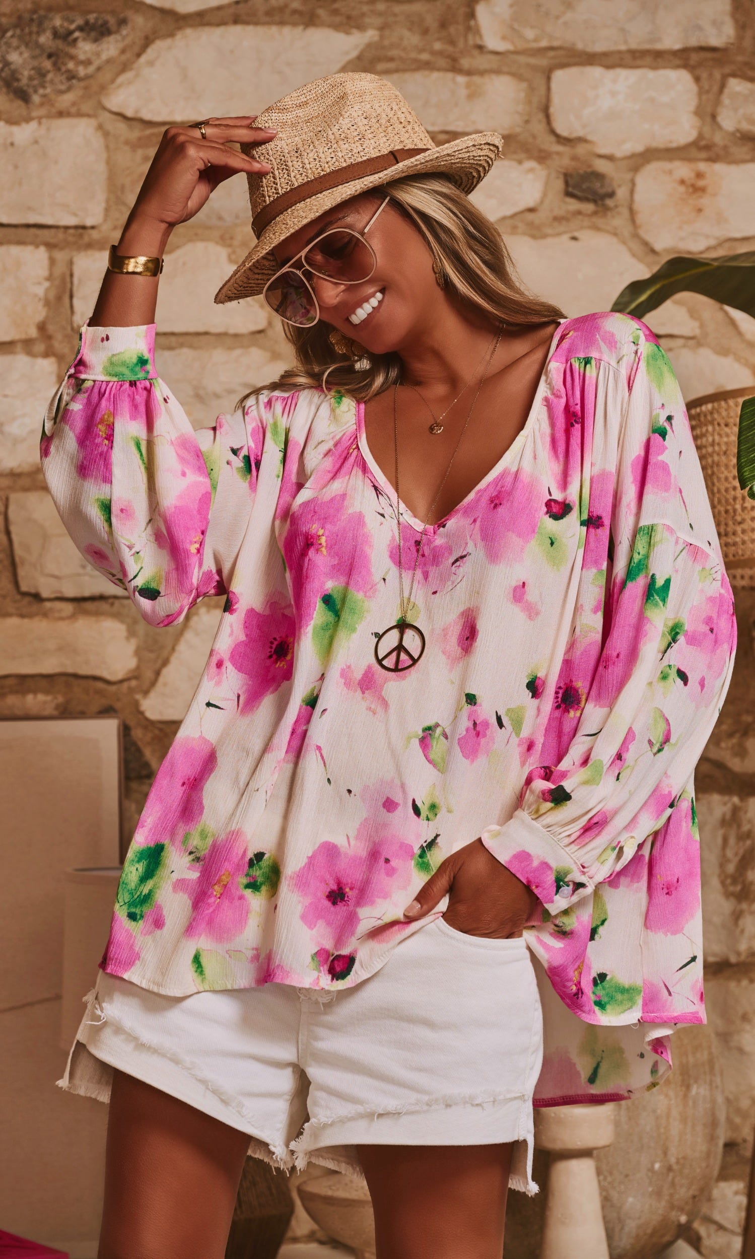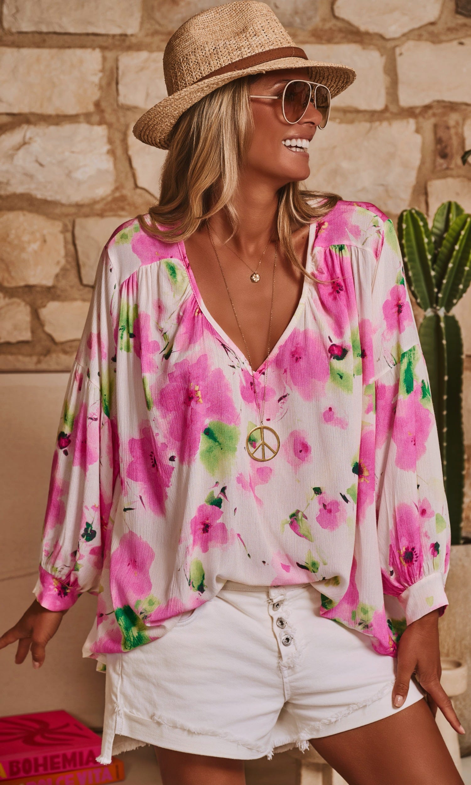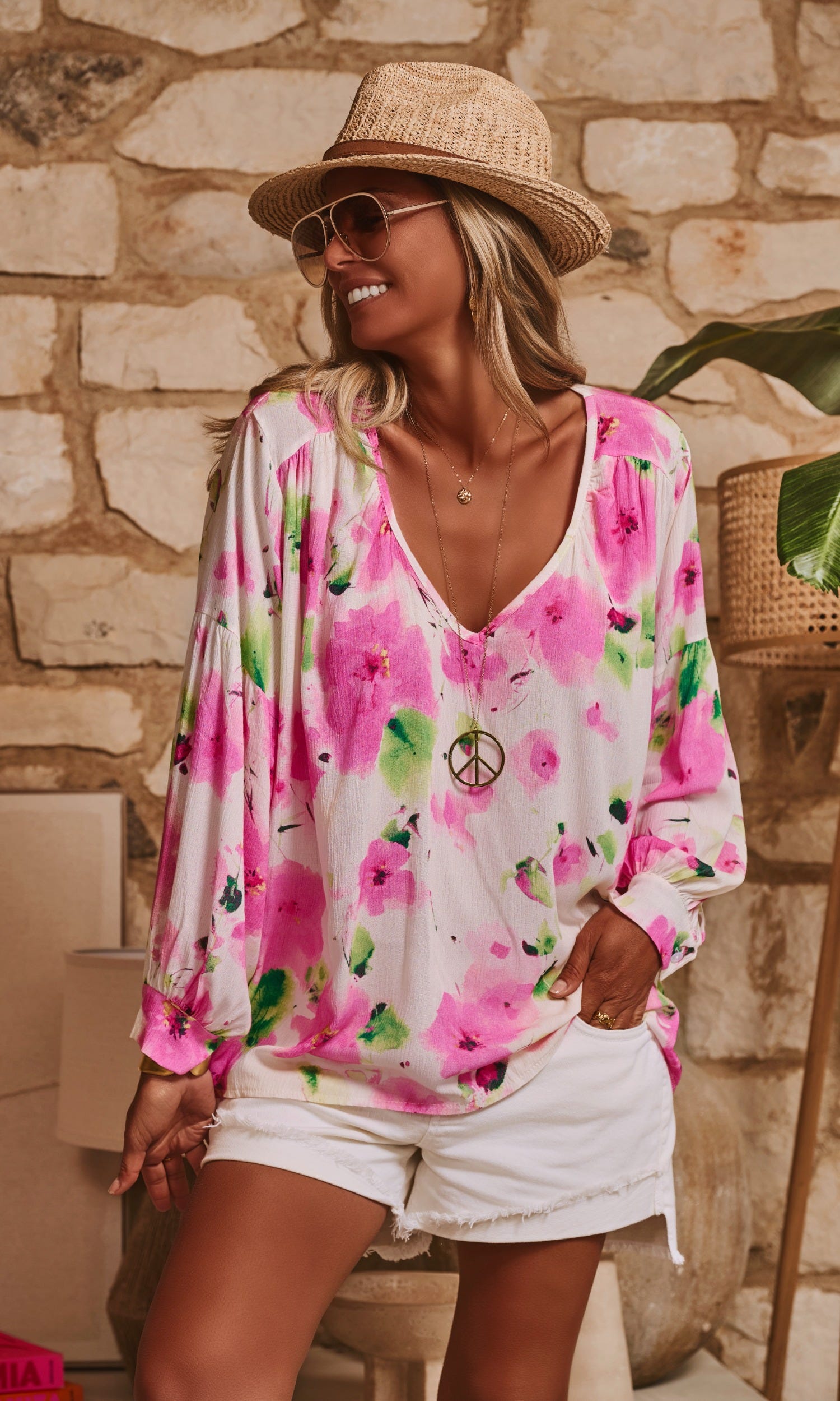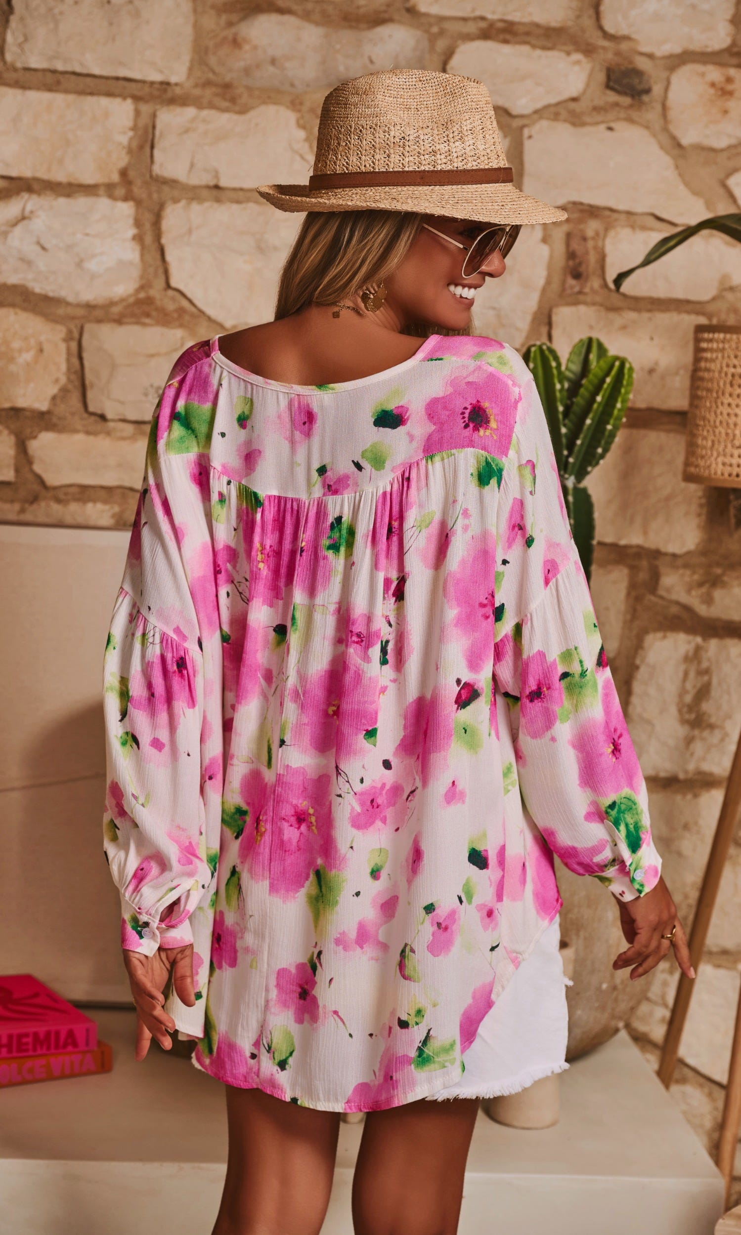 Avec son ourlet arrondi, plus court à l'avant, elle arbore un motif floral rose qui illumine l'ensemble.