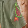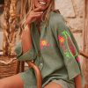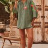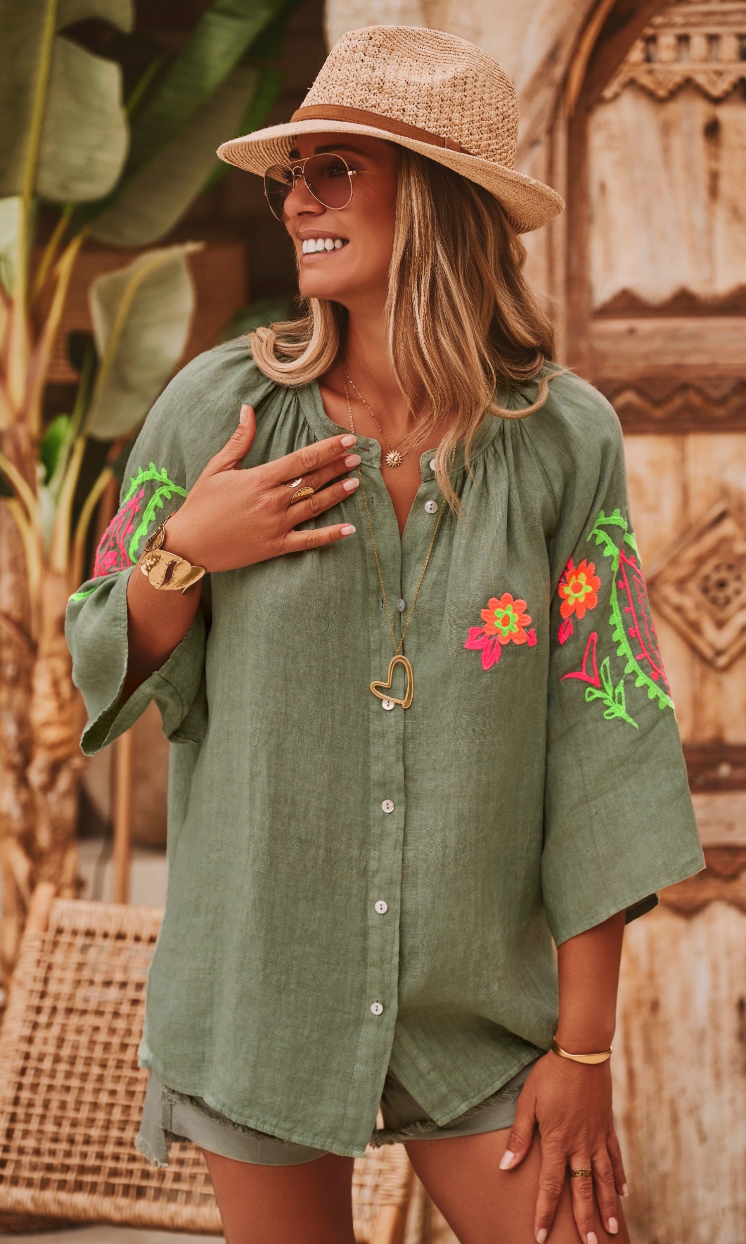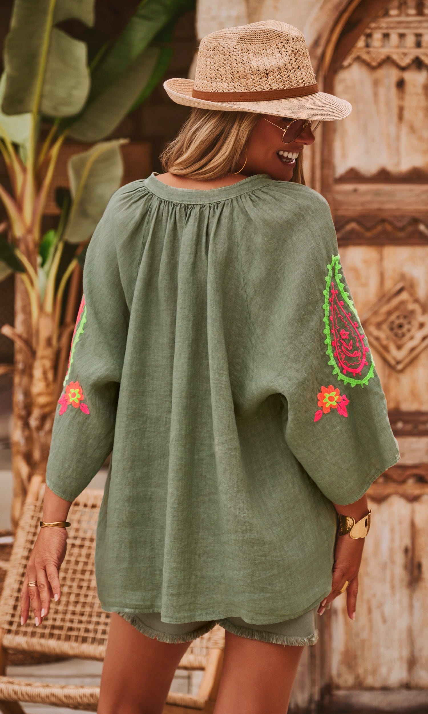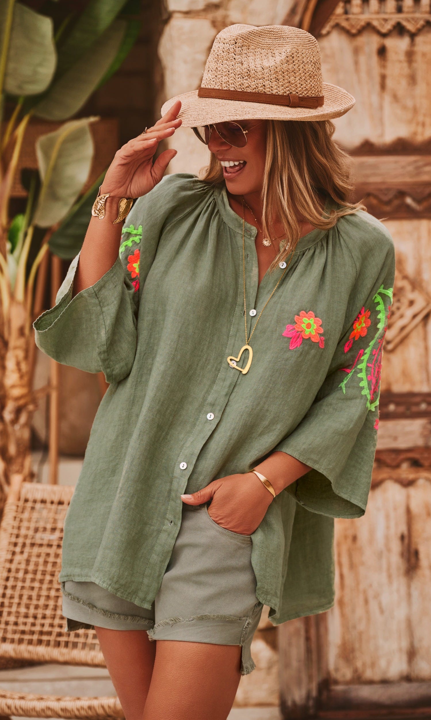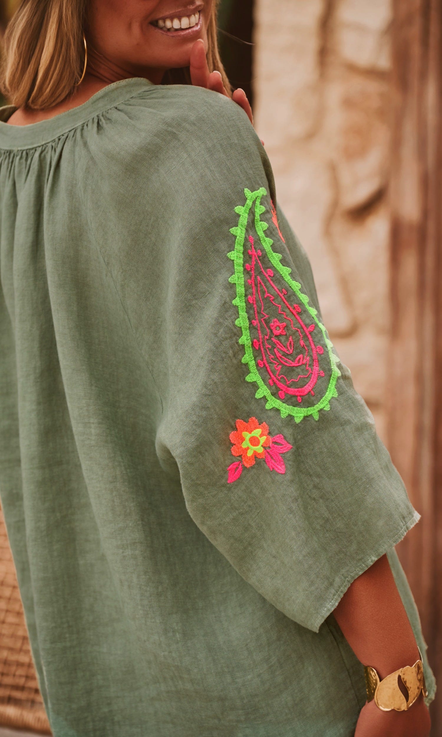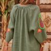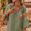Cette tunique chemise en lin kaki, au col rond, arbore des manches longues ouvertes pour une allure élégante et décontractée.