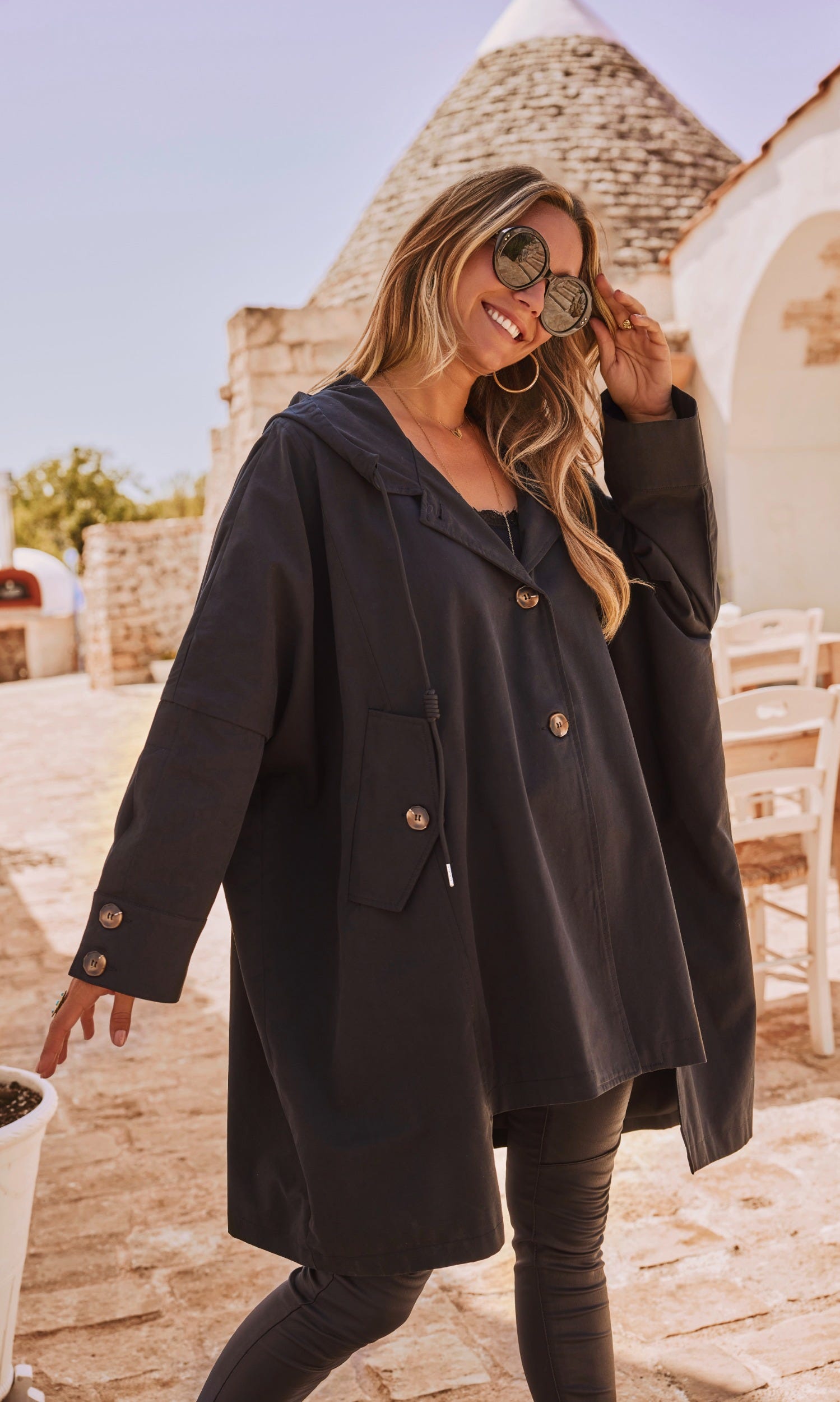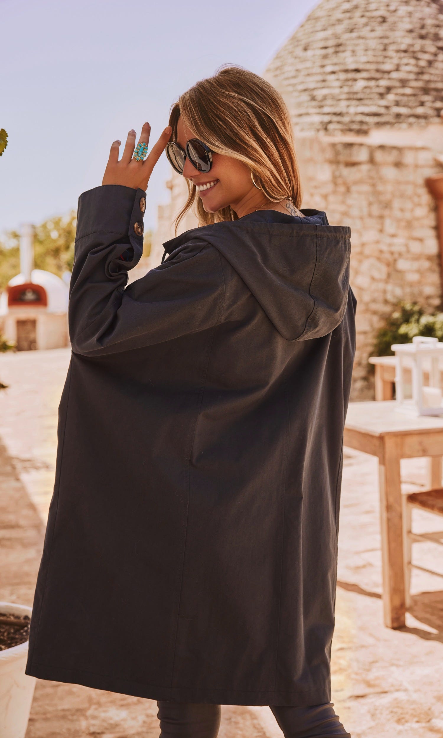 Les deux poches latérales avec rabat boutonné offrent une touche fonctionnelle, tandis qu'une découpe en partie basse souligne son allure unique.