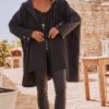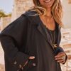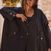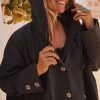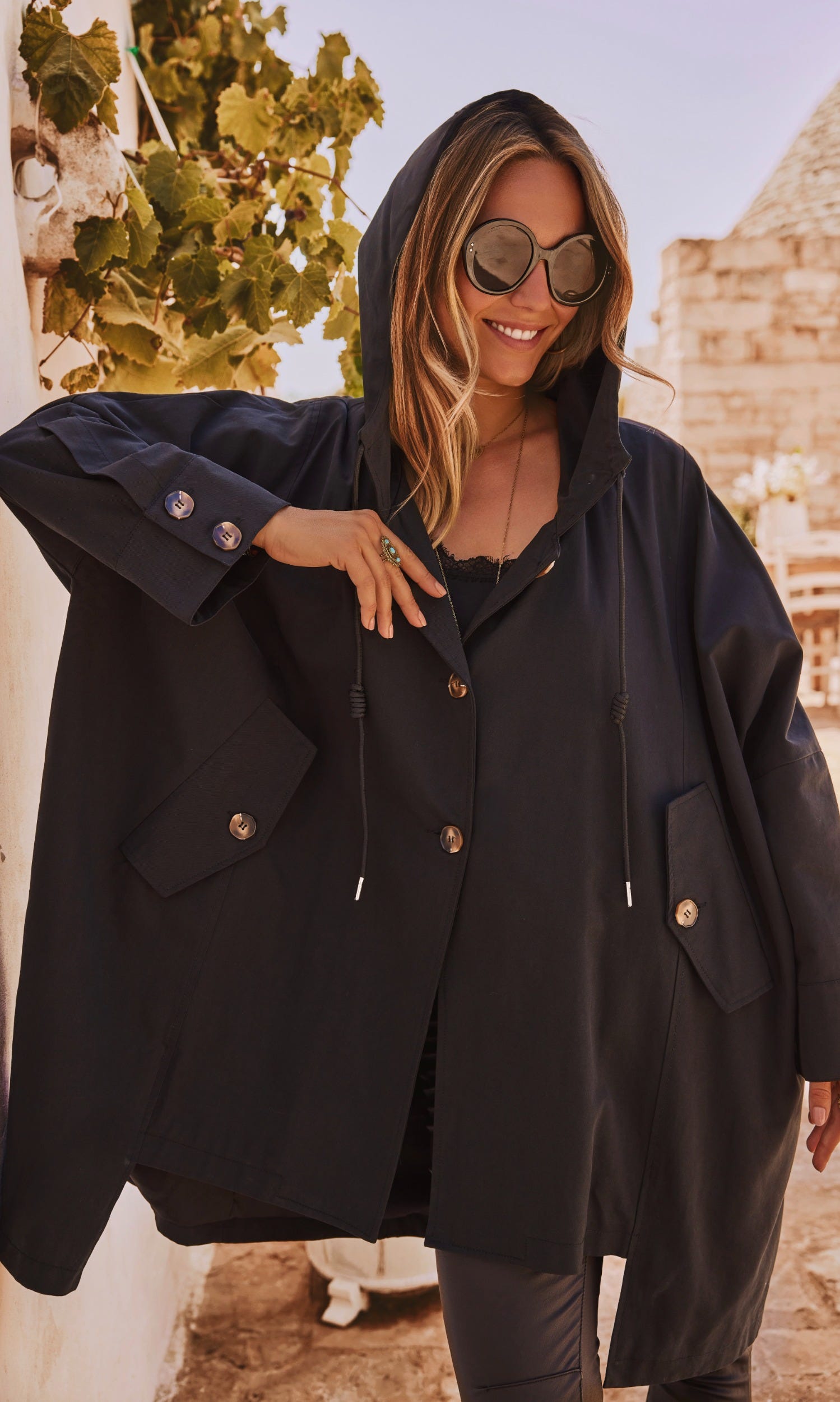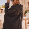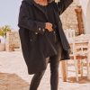 Cette veste oversize noire arbore une élégante doublure et une capuche pratique avec des liens de serrage.