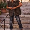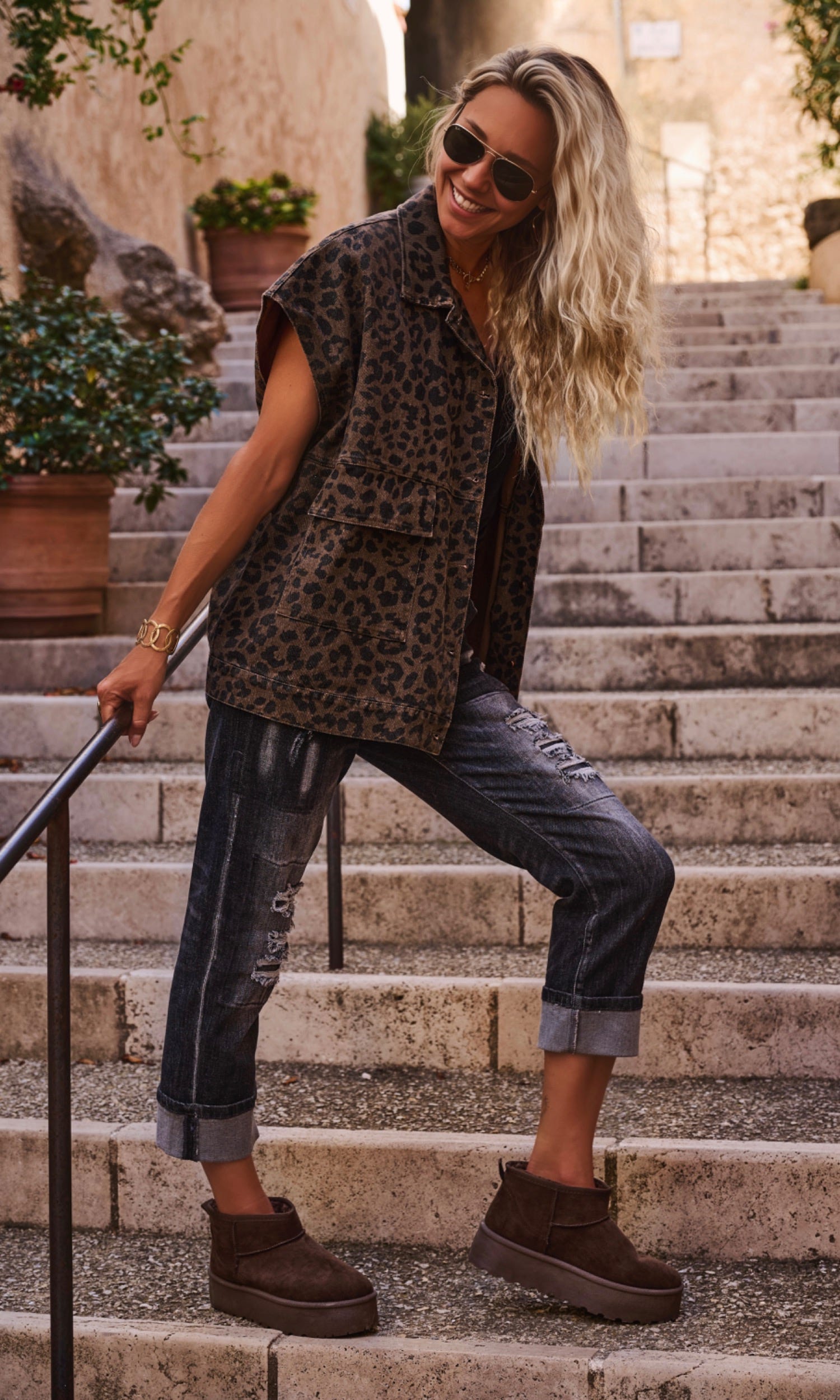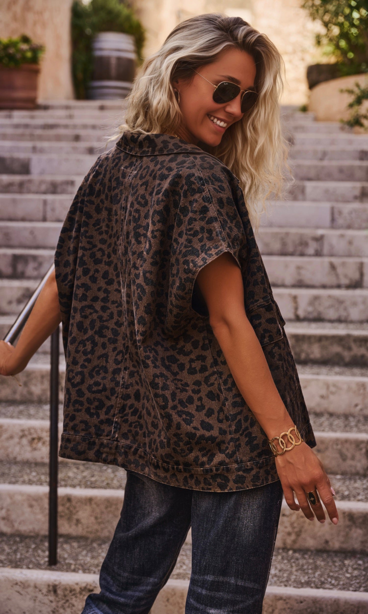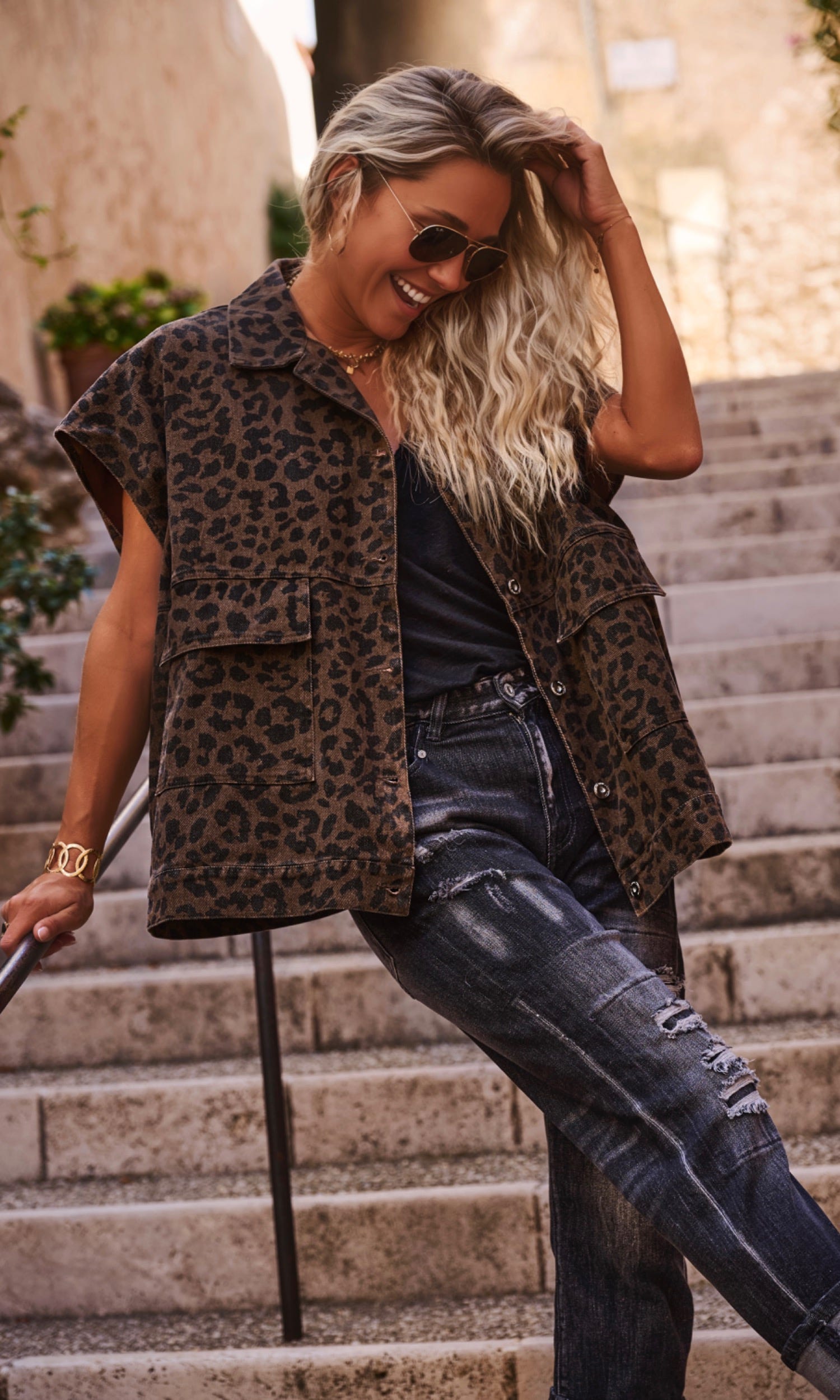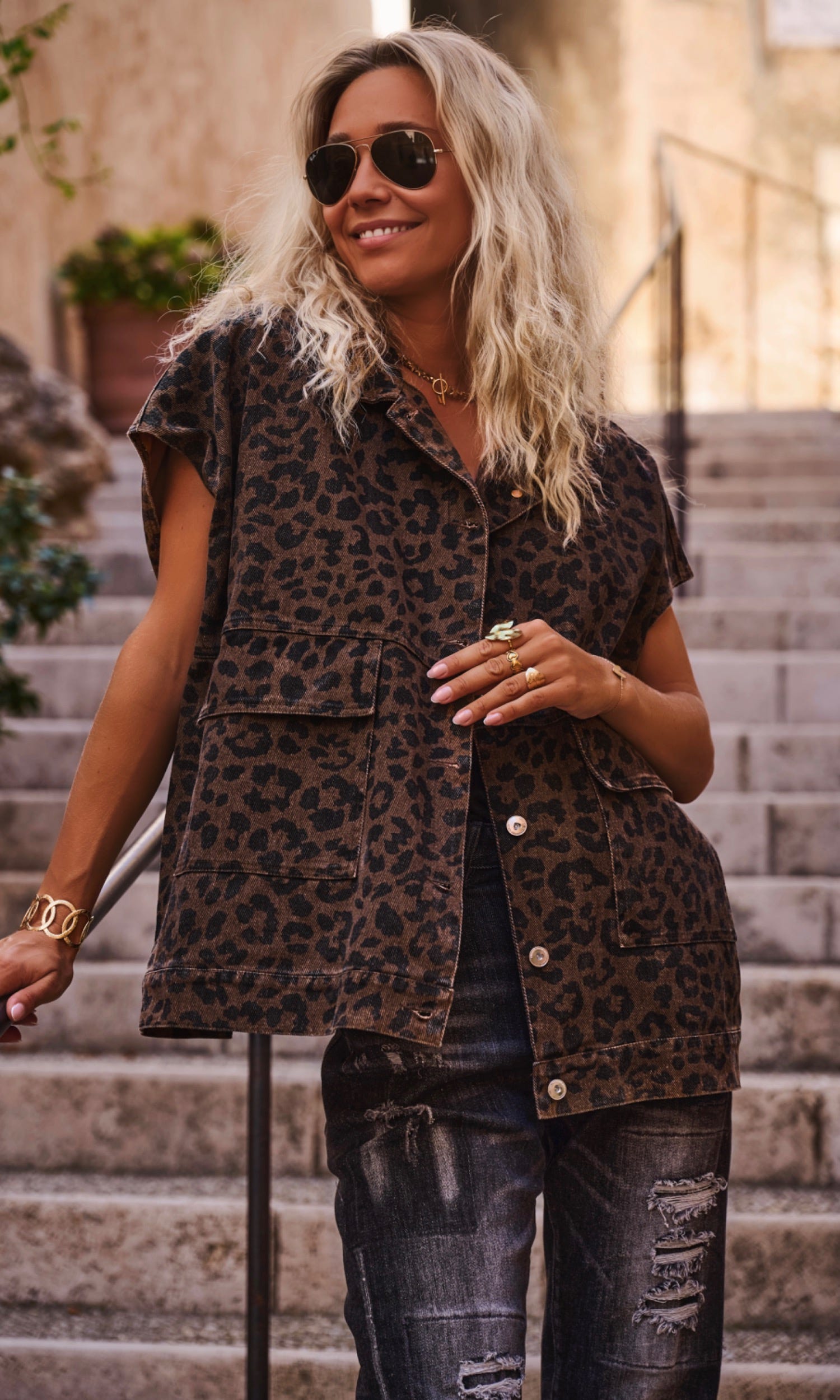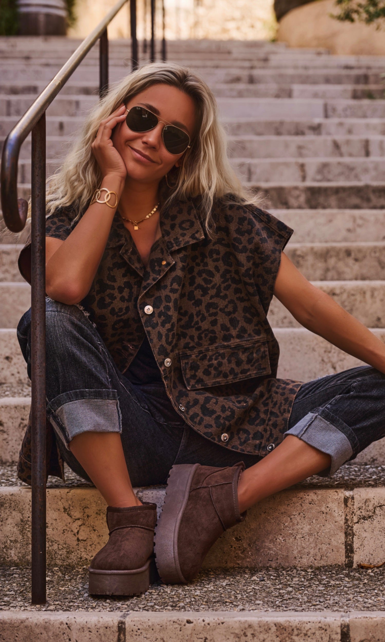 Le motif léopard sur l'ensemble complète ce look audacieux et tendance.
