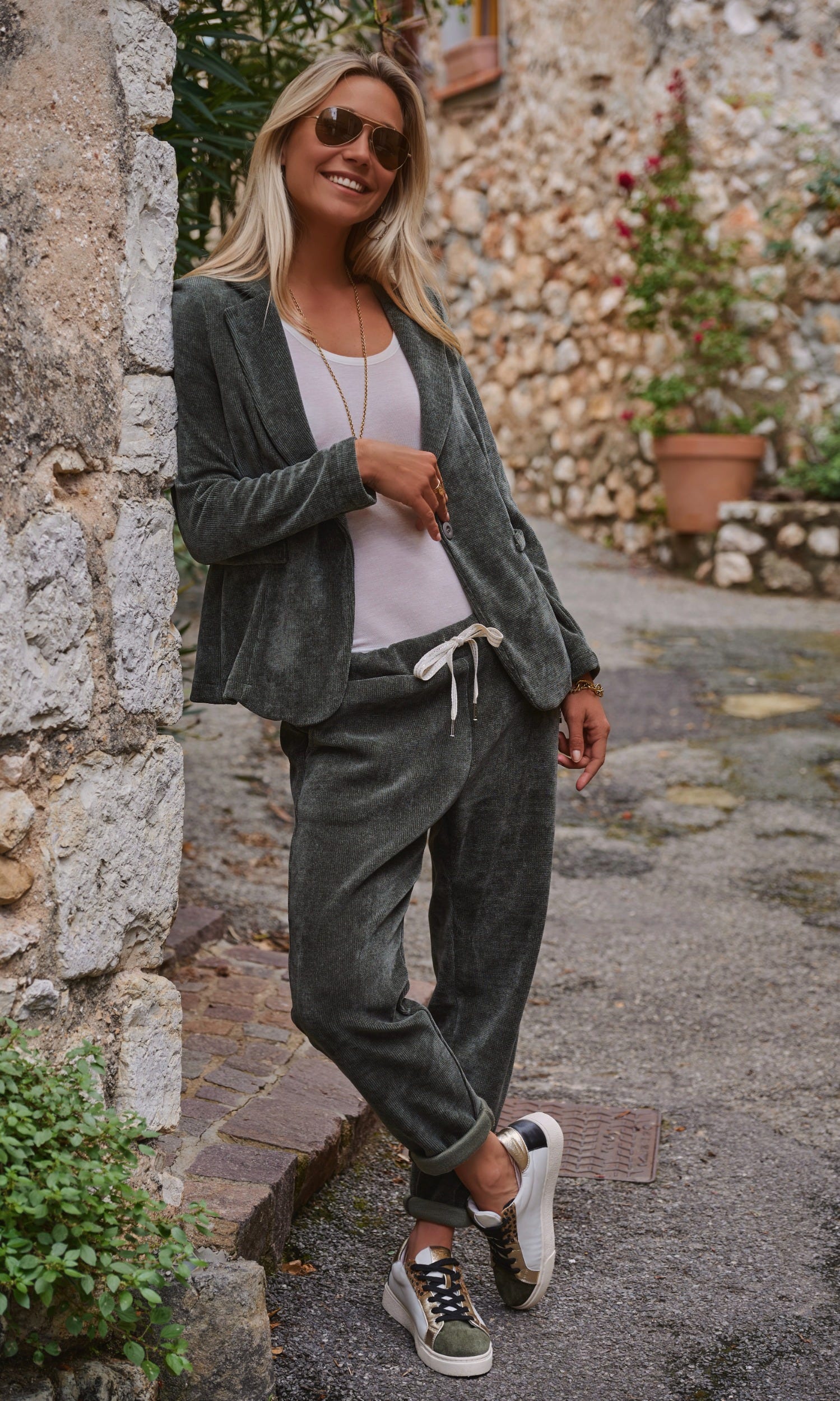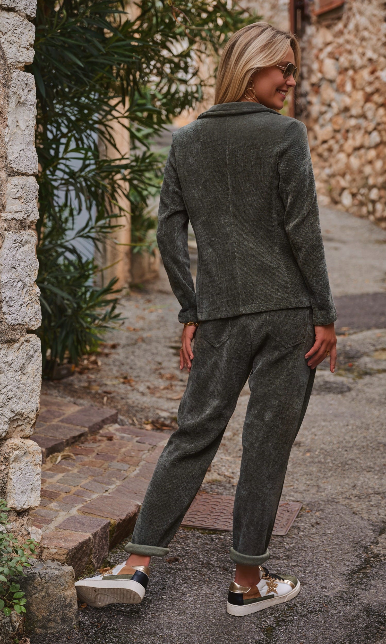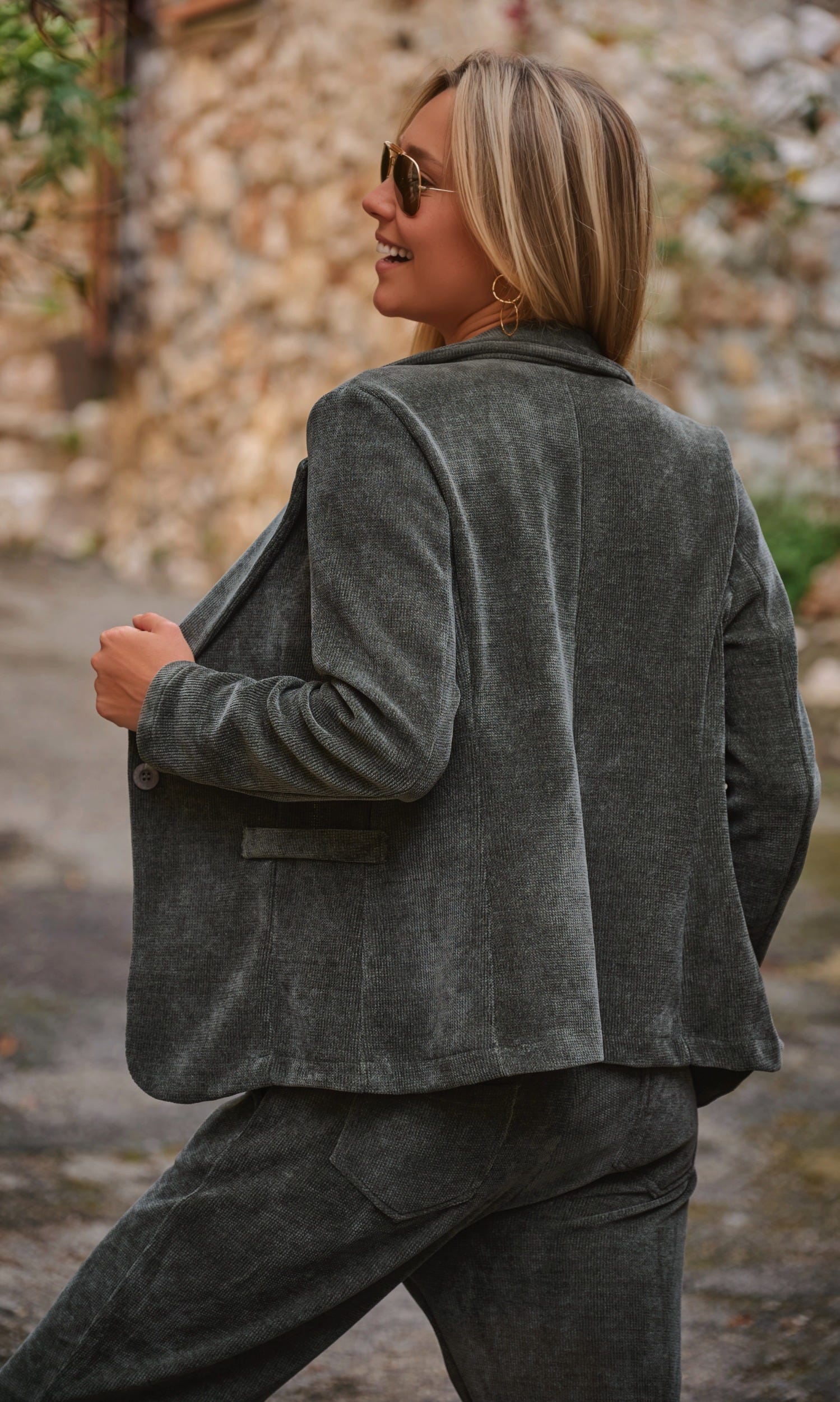 Cette élégante veste tailleur en velours côtelé apporte une touche de sophistication.