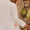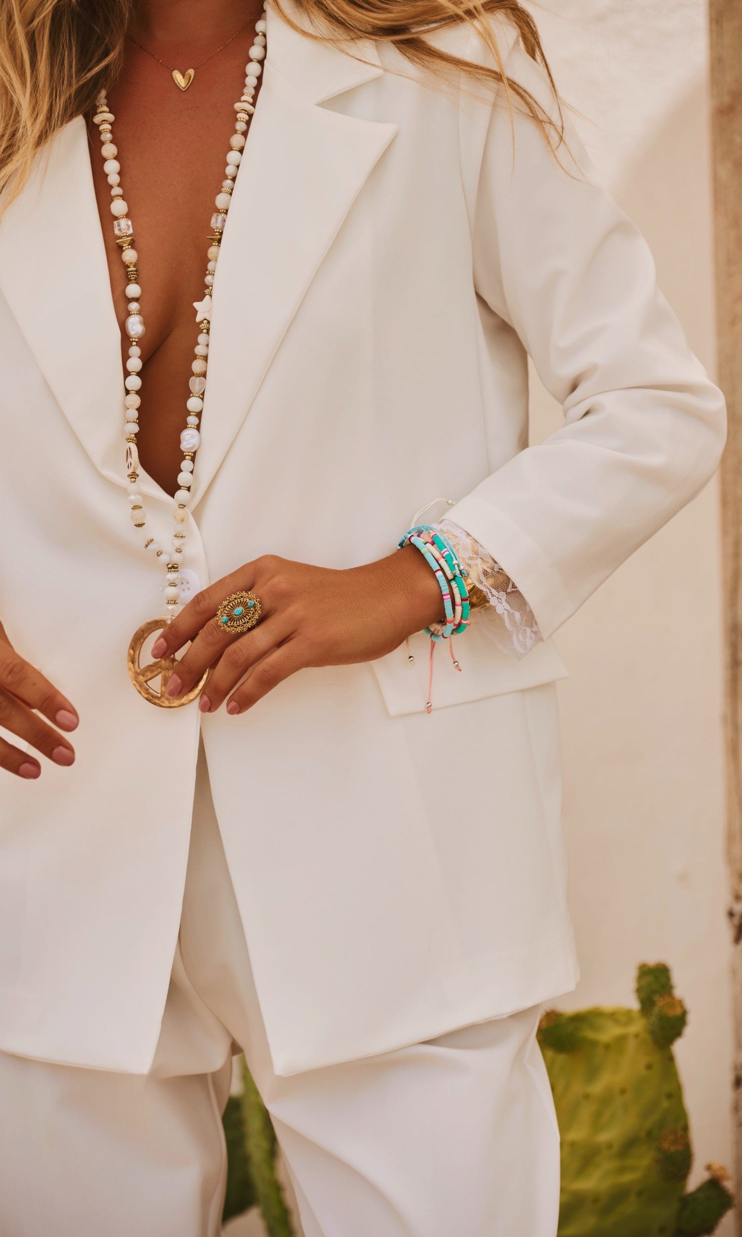 Son style se distingue par des manches longues ornées de dentelle aux poignets et deux poches passepoilées latérales, dont l'une arbore une charmante étiquette MinoDuSud.